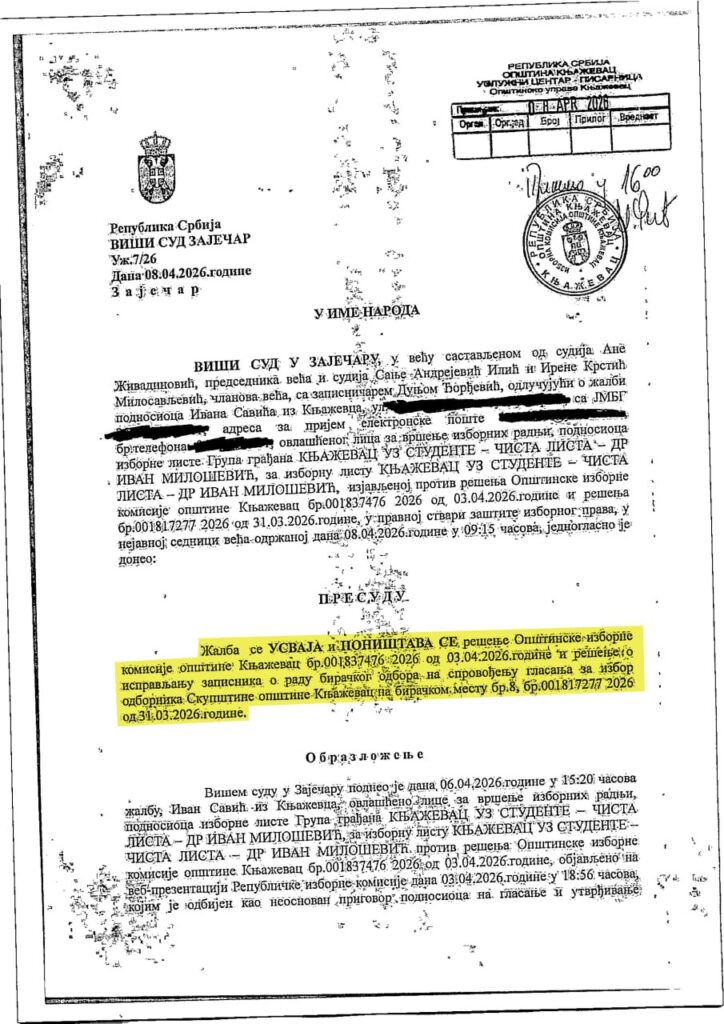Виши суд у Зајечару донео је пресуду у корист листе Групе грађана “Књажевац уз студенте – Листа листа – др Иван Милошевић”.